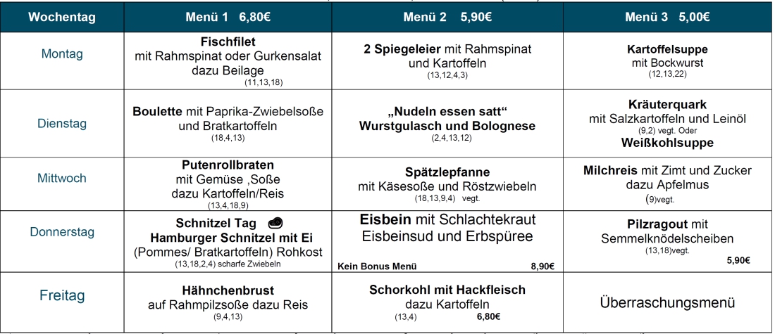 Achtung! Die hier aufgeführten Tagesgerichte sind nicht zwingend mit dem Auslieferungsangebot unseres Menüdienstes identisch!
